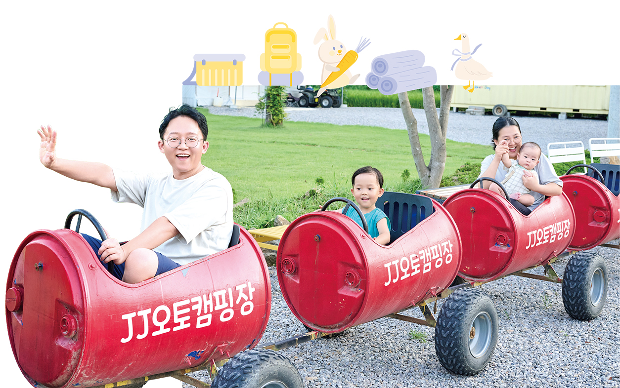 이 캠핑장의 명물인 이른바 ‘깡통기차’를 타는 시간도 가졌다. 사륜 오토바이 뒤에 드럼통으로 만든 기차가 줄줄이 매달려 있었는데, 백상태 소원과 건우, 민주 씨와 은우가 각각 한자리씩 차지하고 앉아 선선한 늦여름 오후의 바람을 마음껏 즐겼다. 깡통기차에서 막 내린 건우가 좋은 기억력을 증명하듯 캠핑장 곳곳을 가리키며 말했다. “저기에는 수영장이 있고 저쪽에는 매점이 있는데, 저녁에는 영화도 틀어줘요!” 백상태 소원의 말처럼 착하면서도 똑똑함을 겸비한 건우를 보고 있자니 저절로 기분이 좋아졌다.