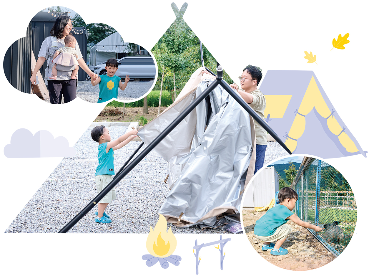 어느새 네 식구의 보금자리가 세워졌다. 때마침 저녁 시간이 찾아오자 테이블을 펴고 음식을 나눠 먹으며 행복감을 끌어올리던 그때 건우가 불현듯 엄마 아빠를 향해 외쳤다. “우리 오늘 꼭 ‘불멍’ 하고 자요!” 부부가 웃으며 건우를 향해 고개를 끄덕거렸다. 그동안 하고 싶었던 게 불멍뿐이랴. 2박 3일을 이곳에서 보내기로 한 네 식구는 순간순간을 알차게 보내겠다고 다짐하며 다가오는 밤을 기꺼이 맞이했다.