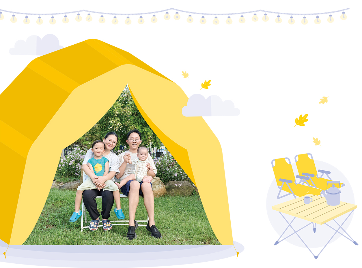 “이런 와중에 작년 봄 둘째를 가지게 됐어요. 허니문 베이비로 들어선 건우를 낳은 뒤 둘째를 갖기 위해 노력했지만 이뤄지지 않아서 마음을 접고 있었는데 예상치 못한 때 작은 기적과 마주한 거죠. 그 뒤로 둘째 은우의 출산 준비와 육아 때문에, 건우에게는 미안하지만 캠핑을 잠시 미루고 있었는데요. 여름과 가을이 겹쳐서 캠핑하기 딱 좋고 둘째에게도 별 무리가 없는 이 시기에 다시 야외로 나가 보자고 아내와 의견을 맞췄고 네 가족의 첫 번째 캠핑을 나오게 됐습니다.”
