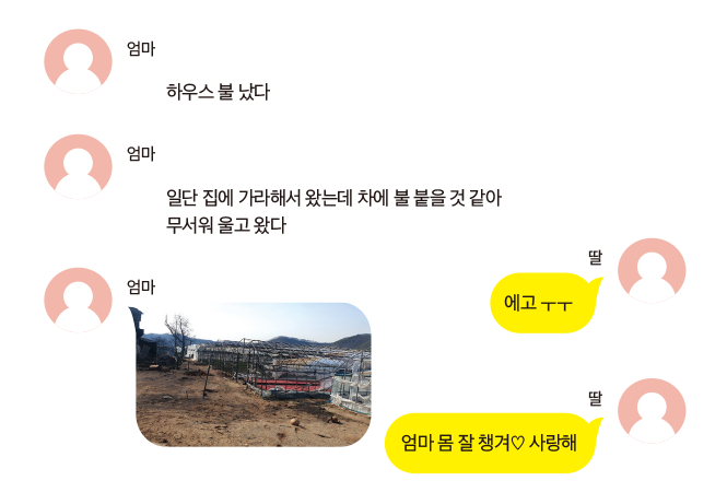 저희 친정 가족은 경북 의성에서 모종 농사를 하고 있습니다. 그런데 어느 날 의성 안평 쪽, 저희 친정 집과는 좀 떨어진 산에 불이 난 겁니다. 헬기도 뜨고 산불 진화에 총력전을 펼치고 있다고 하니 ‘아, 금방 불이 꺼지겠지?’ 하면서도 걱정은 되었습니다. 그런데 뉴스에서 진화 속도가 지지부진하고, 바람이 강해 진화에 어려움을 겪고 있다는 소식을 전해 들었습니다. 매일 뉴스를 보고는 엄마에게 전화를 했는데, 엄마는 딸이 걱정할까 봐 괜찮다고만 하셨어요. 농장 쪽은 아예 불 같은 건 보이지도 않는다며···