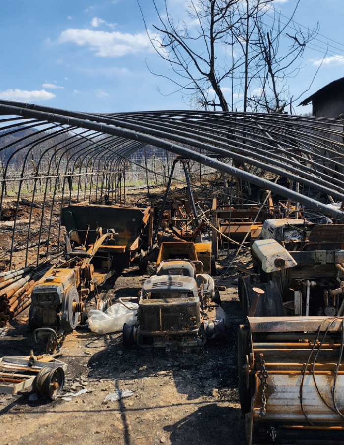 산불이 났다고 하지만 불이 직접적으로 난 곳이 아니었기에 가족들은 모종을 하나라도 빨리 키워 4월부터 출하할 준비를 하며 일을 하고 있었습니다. 저 멀리 산이 불타는 것을 보면서도 말이죠. 결국 산불이 가까이 다가왔지만 농장을 차마 버리고 갈 수 없었기에, 처음에는 호스로 하우스에 물을 뿌리기 시작했답니다.